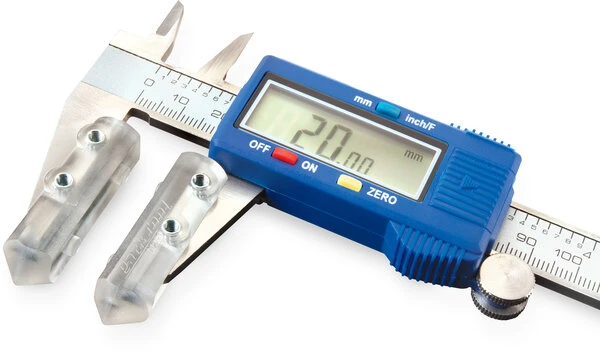 Disc brake rotors should be regularly checked for wear to ensure safety and performance. The DCA-1 installs onto most digital, dial, or vernier calipers (including the Park Tool DC-1) and features protruding contact points that allow measurement of the center of the braking surface, bypassing the unworn edge to ensure an accurate measurement. The conical end points of the DCA-1 can be used to measure center-to-center distances of bolt holes for calculating bolt circle diameter (BCD) of chainrings and cranks.