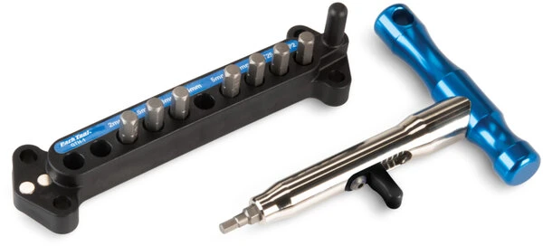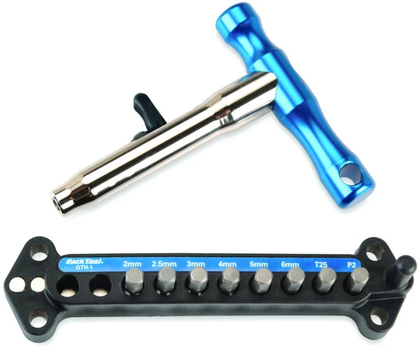 The QTH-1 is an ergonomic T-handled bit driver equipped with eight common bits to fit a wide variety of fasteners and fittings found on bicycles. The magnetic “quick-change” handle allows for one-handed operation and makes changing bits quick and easy. The bit holder can be magnetically attached to any magnetic surface such as a repair stand or tool box, or can be permanently mounted to any wall or tool board. The QTH-1 is a professional-grade tool built to withstand the rigors of daily shop use and is fully rebuildable.