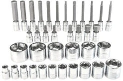 The 37-piece SBS-3 from Park Tool is a comprehensive, shop-quality set of sockets, hex bits, and Torx compatible drivers selected specifically to tackle a wide variety of common bike repair needs. The SBS-3 also includes flat-faced sockets in common sizes for work on suspension forks. Ideal for use with Park Tool torque wrenches, the 3/8″ drive bits and sockets are forged from tough, chrome vanadium steel and nickel chrome plated for lasting durability.