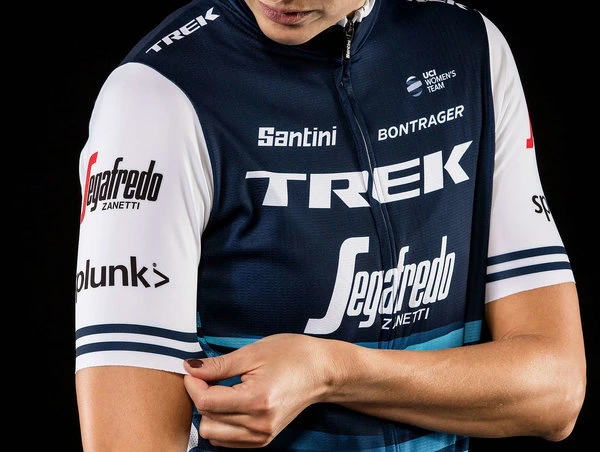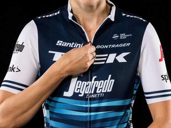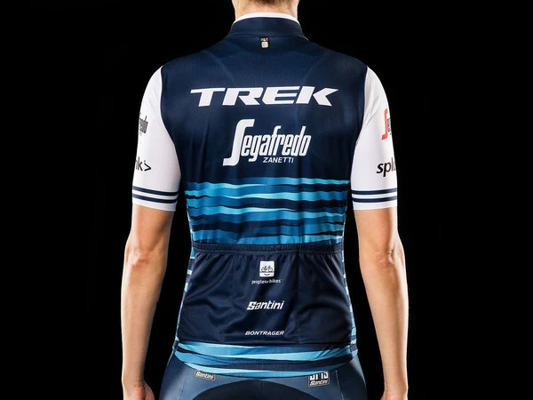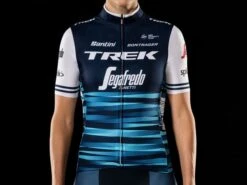 Official team apparel made by Santini with the Trek-Segafredo team logo proudly displayed.
