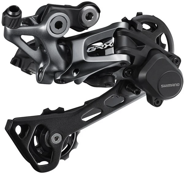 With an integrated chain stabilizer mechanism, the Shimano GRX derailleur provides a quieter experience with shifting security and precision on mixed terrain. For rides on smooth surfaces, the derailleur features and ON/OFF switch for the chain stabilizer. The RD-RX812 rear derailleur is compatible with MTB cassettes with a max cog size of 42T.
