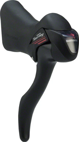 Shimano Tourney ST-A070 shift/brake levers are ergonomic touch points for operating both the bicycle’s brakes and shifting for 2×7 or 3×7 drivetrains.