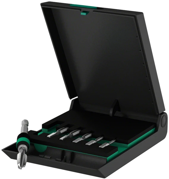 7-piece tapping drill bit set in a stable plastic box for the cutting of metric threads. The hexagonal bit shaft ensures very good power transfer. The finely-tuned material elasticity makes for great durability. Perfect chip removal and a low tilt risk. The Rapidaptor ensures rapid bit change without any extra tools.