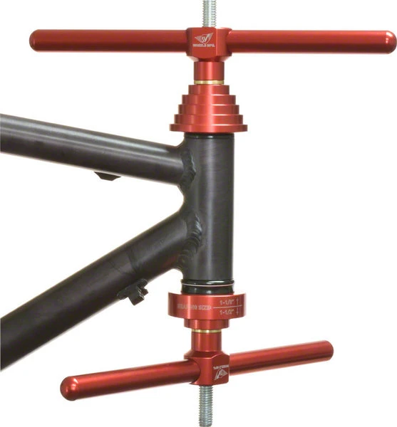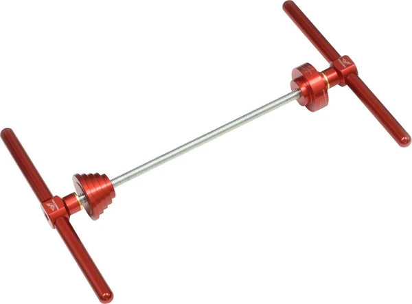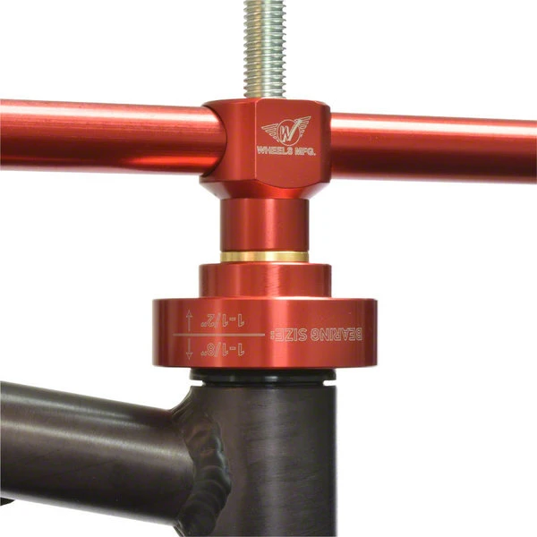 Wheels Mfg Headset Cup Press is a robust, and easy to use tool made up of two machined aluminum handles, 1/2″ threaded rod, and two machined aluminum drifts. One drift is machined with multiple steps to fit common head tube inner diameters. The other drift is two-sided to press in cups with either 1-1/8″ or 1-1/2″ bearings, but may be used for other cups with odd sized sealed bearings. – Machined aluminum handles and drifts – Red anodized drifts and handles – Zinc-plated 1/2″ diameter threaded rod – Long threaded rod works with long head tubes up to 250mm – Includes one Head Tube Drift – Includes one Headset Cup Drift – Laser etched for easy identification – Made in the USA